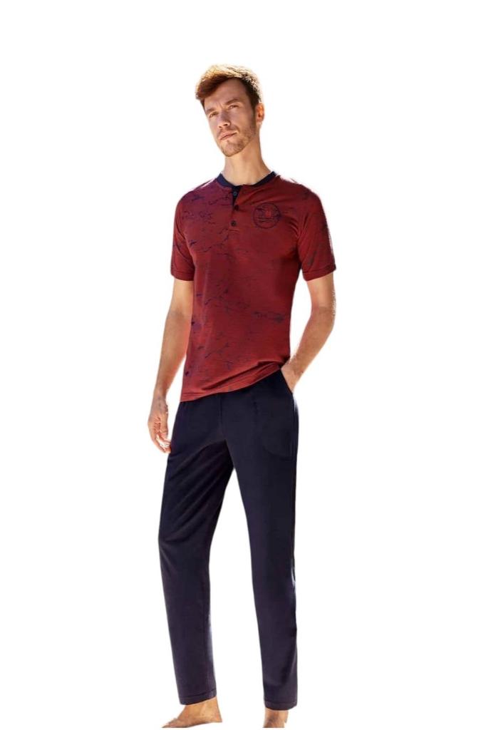 Altı iki iplik üstü jakarlı patlı düğmeli yaka erkek pijama takım,